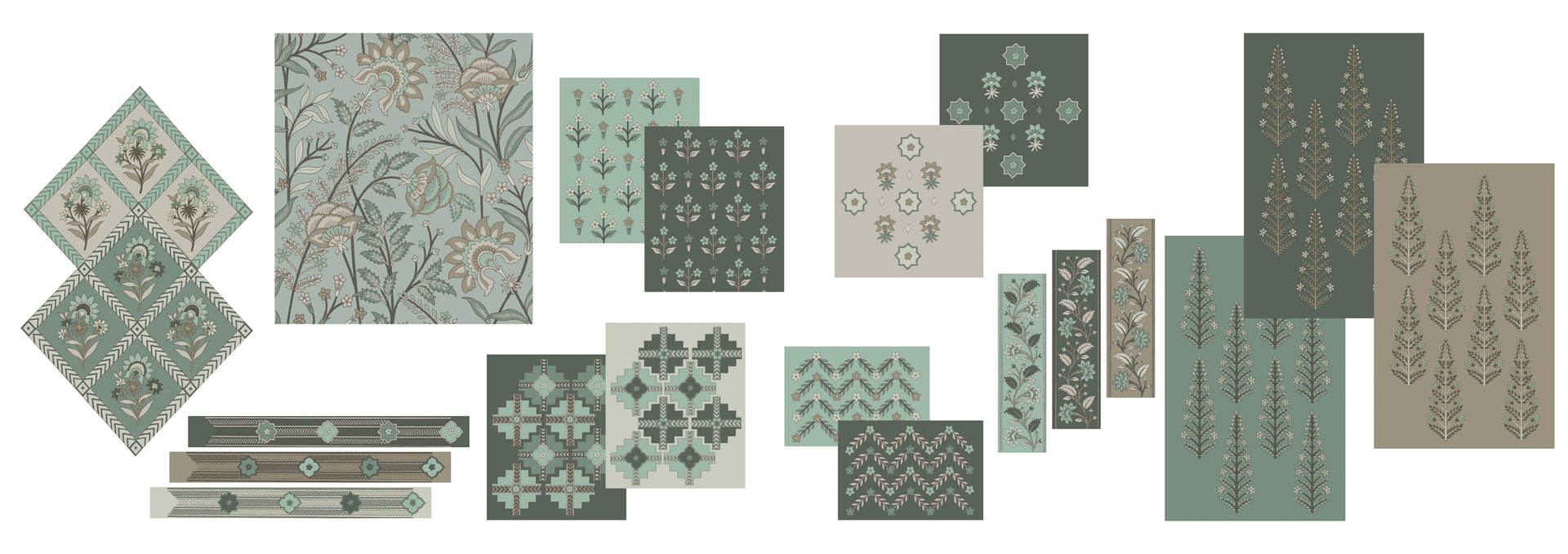 The approach involved acclimating myself to the specific forms, curves, and overall drawing style relevant to the project. A comprehensive practice of tracing old artworks and the client’s previous projects was undertaken to gain a nuanced understanding of the prevalent motifs and forms employed. Additionally, extensive research about the client and the style of block printing was conducted to delve into the intricacies of the particular style, serving as a source of inspiration and refrence point for the collection under development.
